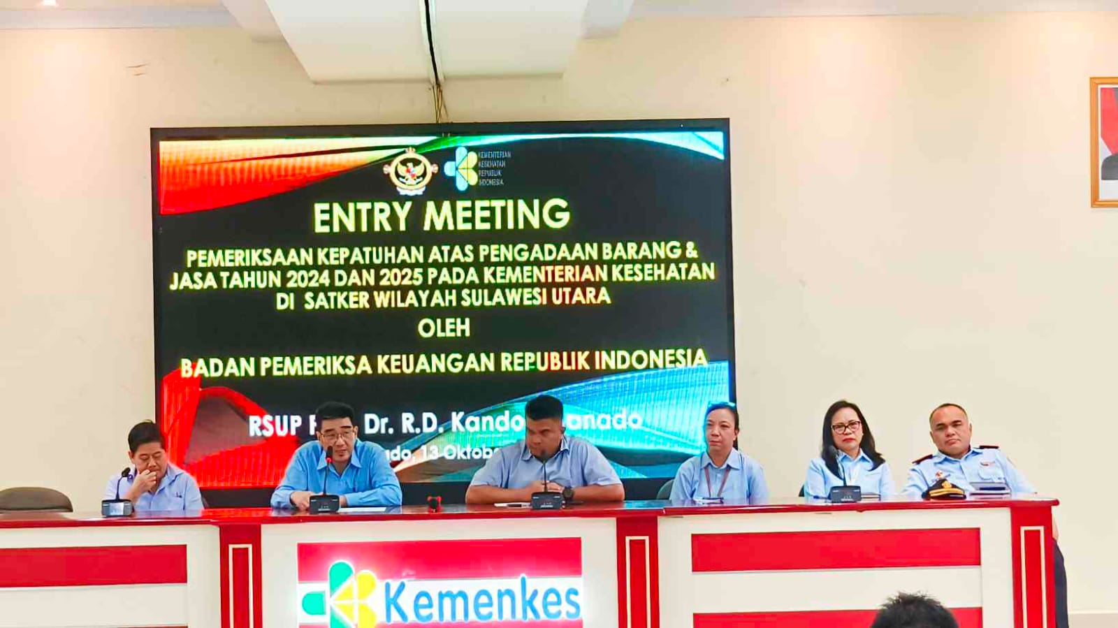 RSUPKANDOU.COM, MANADO — Tim Badan Pemeriksa Keuangan Republik Indonesia (BPK RI) menggelar Entry Meeting Pemeriksaan Kepatuhan atas Pengadaan Barang dan Jasa Tahun 2024–2025 pada satuan kerja (Satker) Kementerian Kesehatan di wilayah Sulawesi Utara. Kegiatan ini berlangsung di Aula Lantai 2 Kantor Administrasi RSUP Prof. Dr. R. D. Kandou Manado, Senin (13/10/2025) pukul 14.00 WITA.
