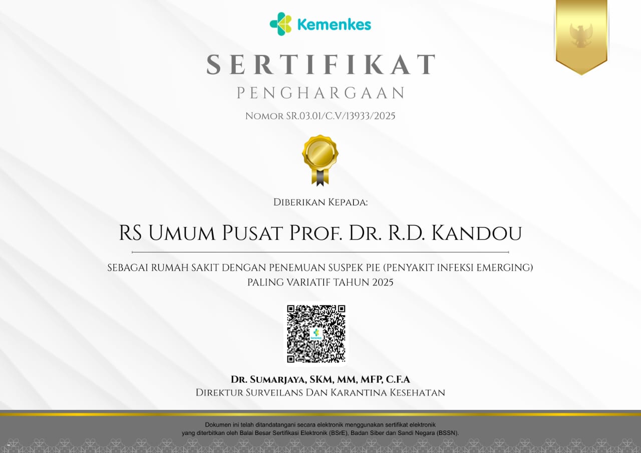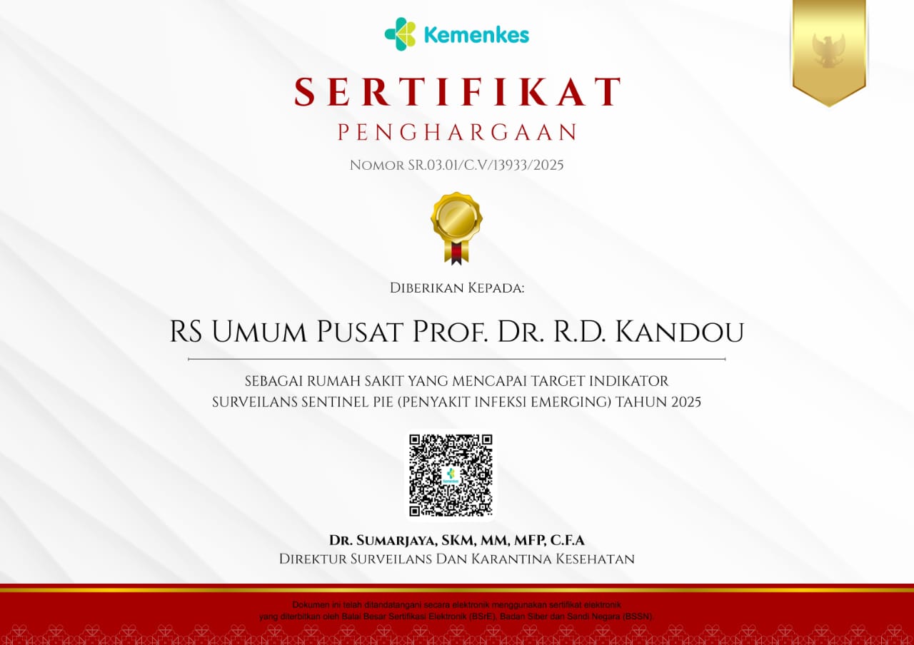 RSUPKANDOU.COM, MANADO — RSUP Prof. Dr. R. D. Kandou Manado kembali menorehkan prestasi membanggakan di tingkat nasional. Rumah sakit rujukan utama di Sulawesi Utara ini berhasil meraih dua Sertifikat Penghargaan bergengsi dari Kementerian Kesehatan Republik Indonesia melalui Direktorat Surveilans dan Karantina Kesehatan untuk Tahun 2025.