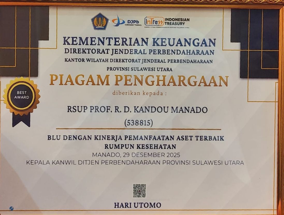 RSUPKANDOU.COM, MANADO — RSUP Prof. Dr. R. D. Kandou Manado kembali menorehkan prestasi membanggakan dengan menerima Piagam Penghargaan sebagai BLU dengan Kinerja Pemanfaatan Aset Terbaik Rumpun Kesehatan dari Kementerian Keuangan Republik Indonesia melalui Direktorat Jenderal Perbendaharaan Kantor Wilayah Provinsi Sulawesi Utara.