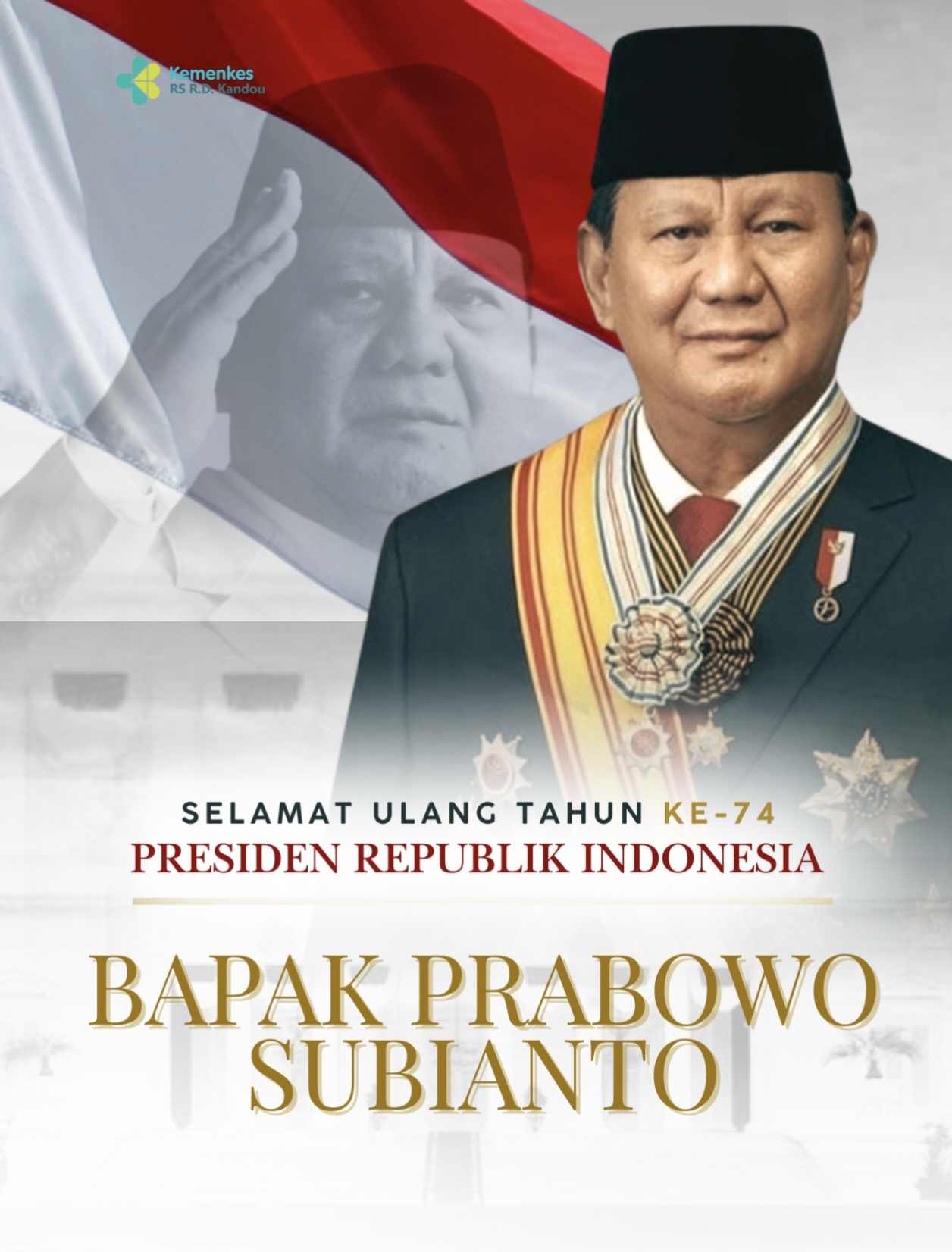 Dewan Pengawas, Direksi, dan Segenap Civitas Hospitalia RSUP Prof. Dr. R. D. Kandou Manado mengucapkan: Selamat Ulang Tahun ke-74 Kepada Presiden Republik Indonesia, Bapak H. Prabowo Subianto